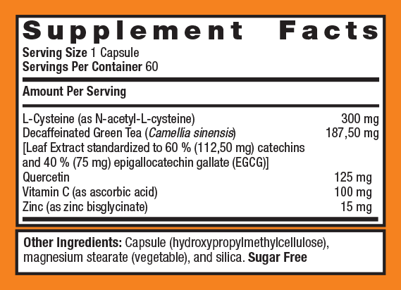 It combines vitamin C, zinc, quercetin, NAC, and EGCG to reduce oxidative stress and support immune cell function.