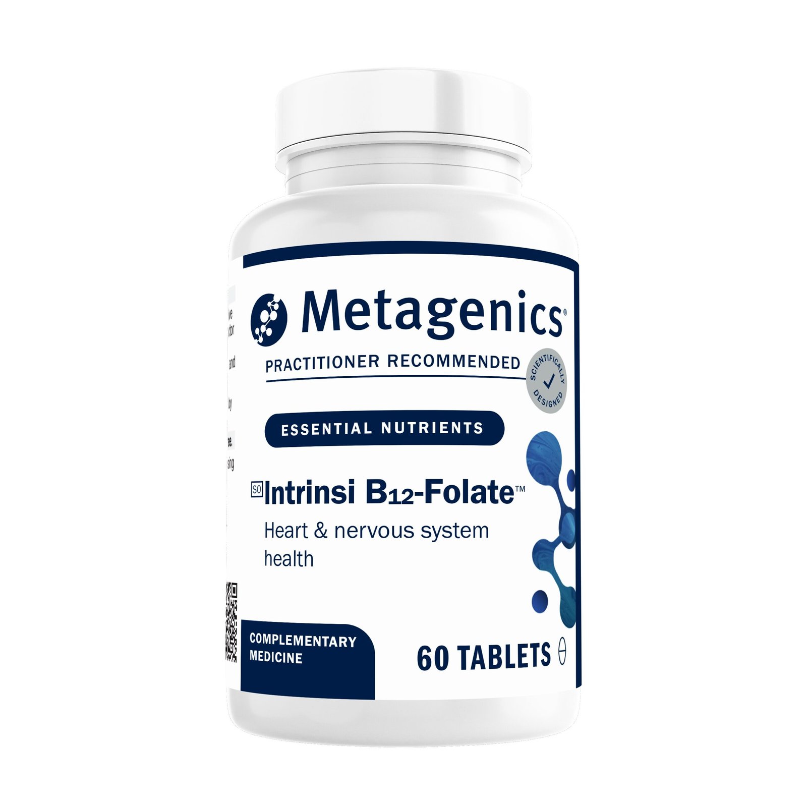 Metagenics Intrinsi B12-Folate delivers a combination of bioactive vitamin B12 (methylcobalamin) and folate (L-5-methyltetrahydrofolate) to support healthy red blood cell production, nervous system function, and energy metabolism. These two essential nutrients play a critical role in DNA synthesis and red blood cell formation, while also supporting the body’s methylation pathways for overall well-being.